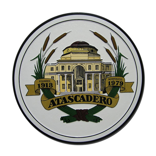 We have provided the City of Atascadero, California with our solid mahogany wooden wall seals and emblem plaques. Now available are our traditional solid mahogany wooden plaques or you can order our indoor-outdoor High Density Urethane plaques. Order online or call our design consultants between 9:00 a.m. EST and 6:00 p.m. at 1-800-381-9457.