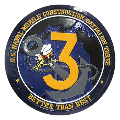 Since 1991 we have provided United States Navy (USN) Seabees Construction Battalion 3 (MCBT3) offices with wooden wall seals and emblem plaques. Now available are our traditional solid mahogany wooden plaques or you can order our indoor-outdoor High Density Urethane plaques. Order online or call our design consultants between 9:00 a.m. EST and 6:00 p.m. at 1-800-381-9457. Order turnaround is two to six weeks depending on what shipping option you choose. Six-week shipping is FREE! Click here for product reviews. We accept government purchase orders via phone or choose, “purchase order”, in our shopping cart.